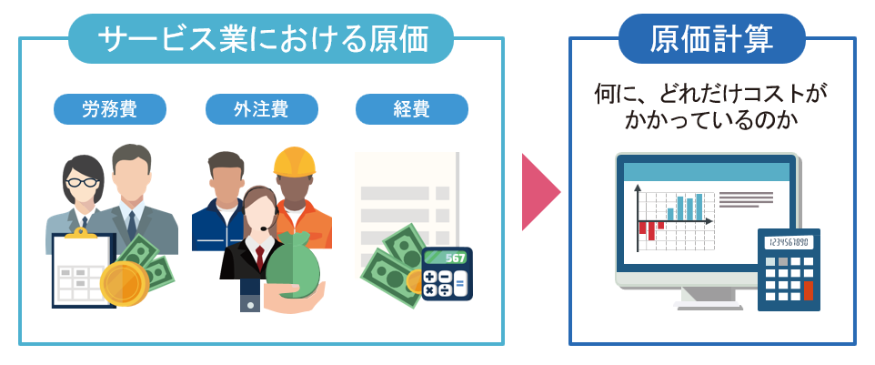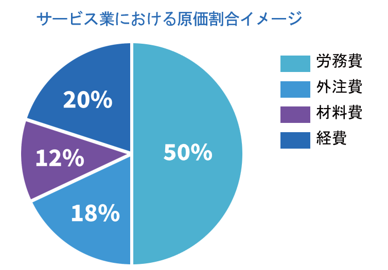 製造業と異なり「モノ」ではなく「ヒト」と「時間」によって価値を提供するサービス業では、原価の把握が難しい傾向があります。正確に原価を把握するためには、労務費や外注費を中心としたコスト構造の可視化が重要です。
