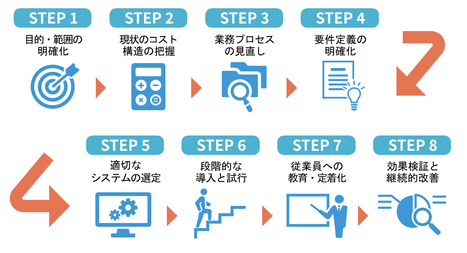 サービス業の原価計算における原価管理システム・ERPの活用は、日々のコスト情報を正確かつ迅速に把握し、属人化やヒューマンエラーを防ぐうえで非常に有効です。本章では、原価管理システム導入に向けた実践的なステップをご紹介します。