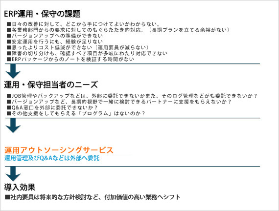ERP導入後、各部門からの要求やバージョンアップへの準備などに対応しようとしても、経験不足のために効率よく対応できず、安定した運用につながらない。また運用要員が必要となるため、思っていたよりコスト削減につながらないなど、多岐にわたる運用に関する課題を抱えています。お客様の中にはJOB管理やバックアップなどは、外部に委託できないか、また、そのログ管理なども委託できないかなどを考えておられる方もいるのではないでしょうか。 ベニックソリューションの運用アウトソーシングなら、10年以上にわたる川崎重工グループの運用経験を活かした、高品質なERP(SAP、GRANDIT)の運用保守サービスの提供が可能です。